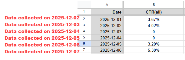 - Set date to 2025-12-09. Click export. Get's data. Appends row